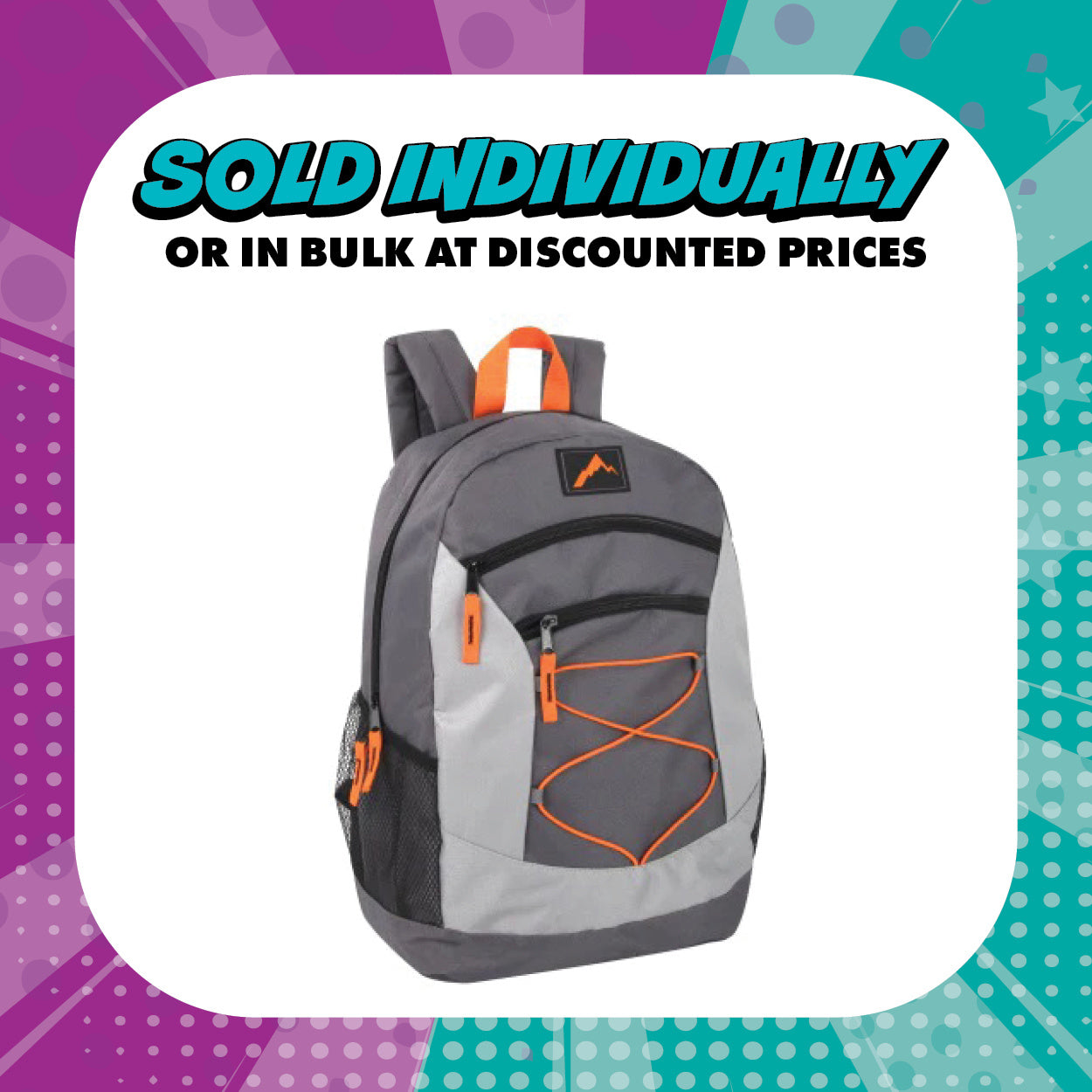 Buying High School Backpacks in bulk is the ultimate way to save money. School budgets are always thin so we've made it a point to offer high quality backpacks at affordable prices. Recommended for children grades 9th-12th. With its large design, this backpack is packed with cool features including stylish bungee cord detailing, adjustable and sturdy straps, two mesh side pocket for easily storing water bottles or gear, and two front pockets for added storage. Built from extra durable 600 denier polyester. 18" x 13" x 7". Styles, colors and assortments may vary. Random color.