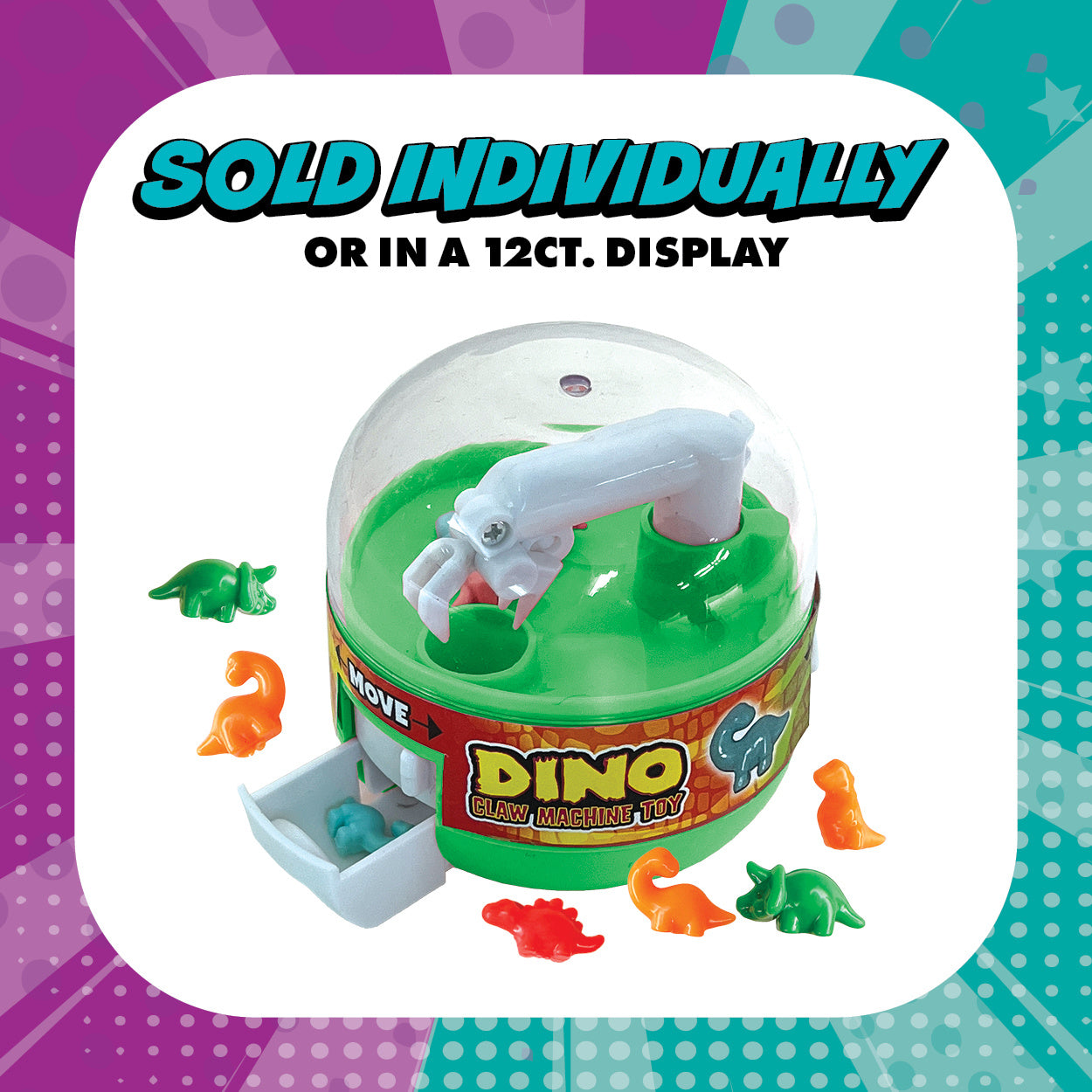 The smallest claw machine around fits in the palm of your hand! Each toy contains 8 mini dinosaur prizes in red, orange, and green. Do you have the skills to grab them up?! Control the claw with 3 levers (left/right, up/down and grab). Open the chute to collect your prize!