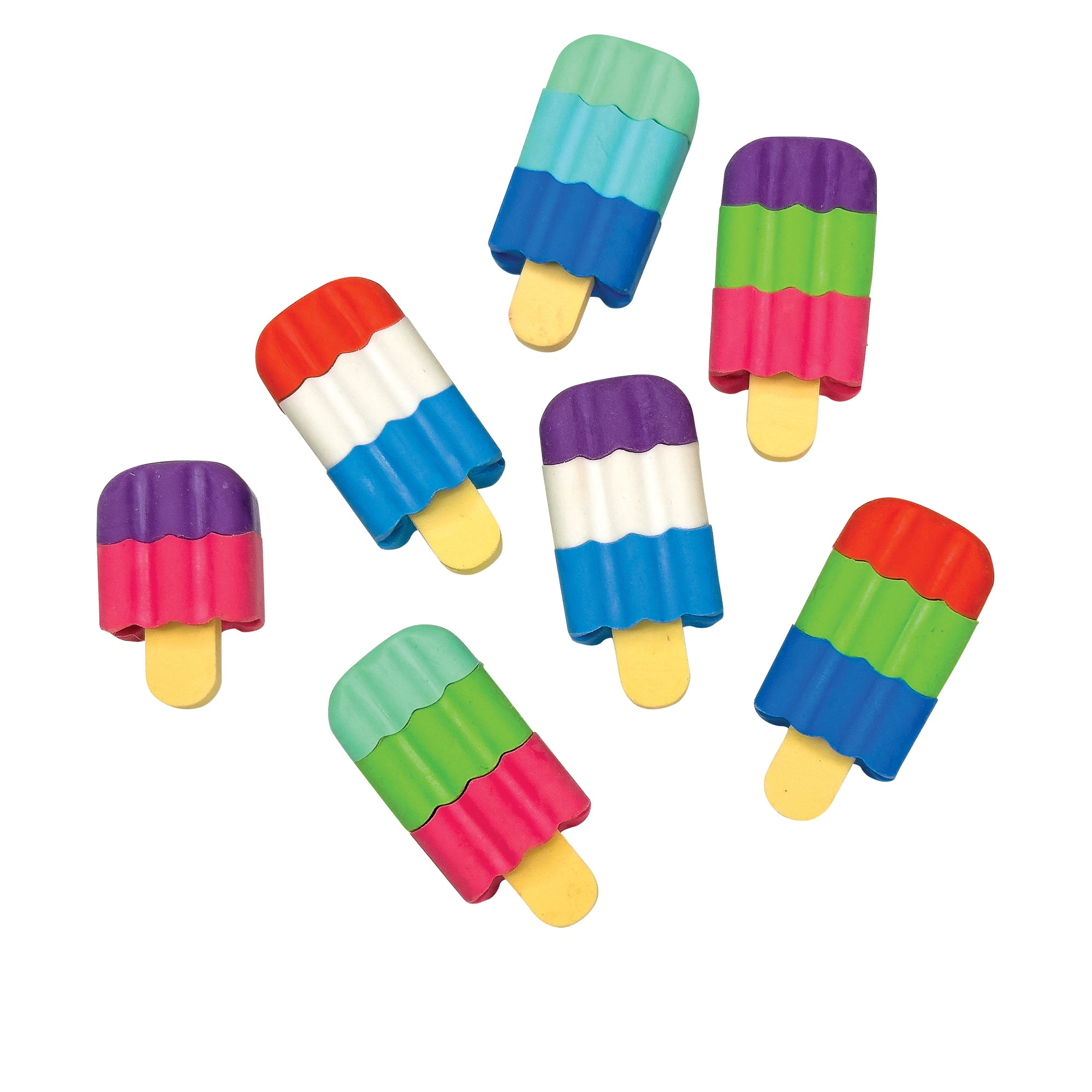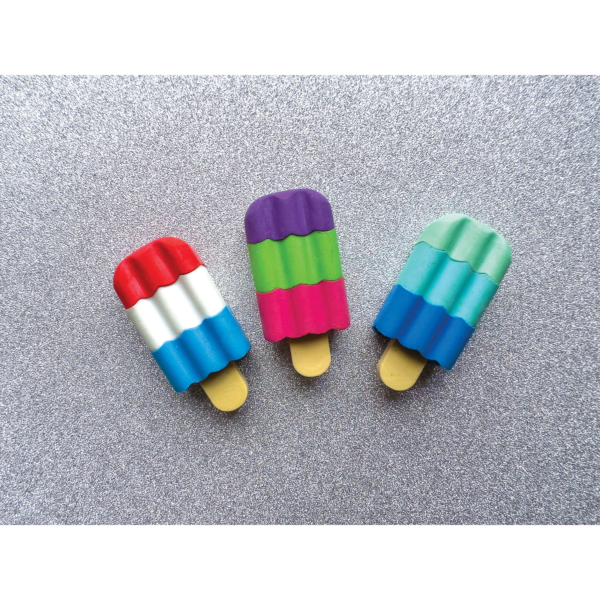 Cool pops with sweet scents! Ice cream bar shaped erasers that come apart to mix and match colors and scents. 3 color combos & scents: red/white/blue (strawberry), purple/green/pink (grape), and aqua/lt. blue/dk. blue (blueberry).