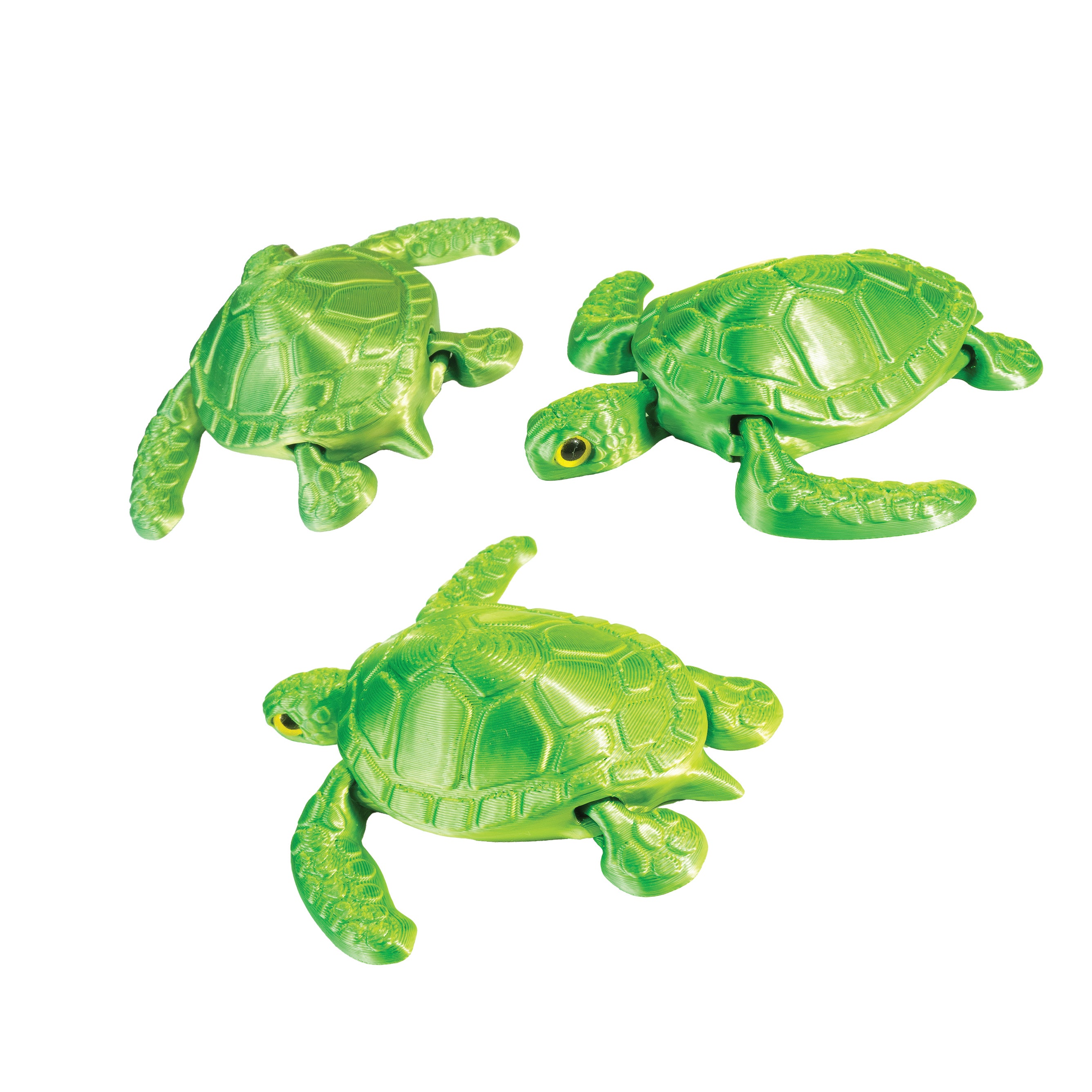 Made with durable 3D printing technology, the realistic, articulated design also makes it a perfect visual aid for science and nature lessons — inspiring curiosity about marine life while building fine motor skills. Each turtle shimmers with a two-color, iridescent finish that catches the light like rippling waves on the ocean floor.