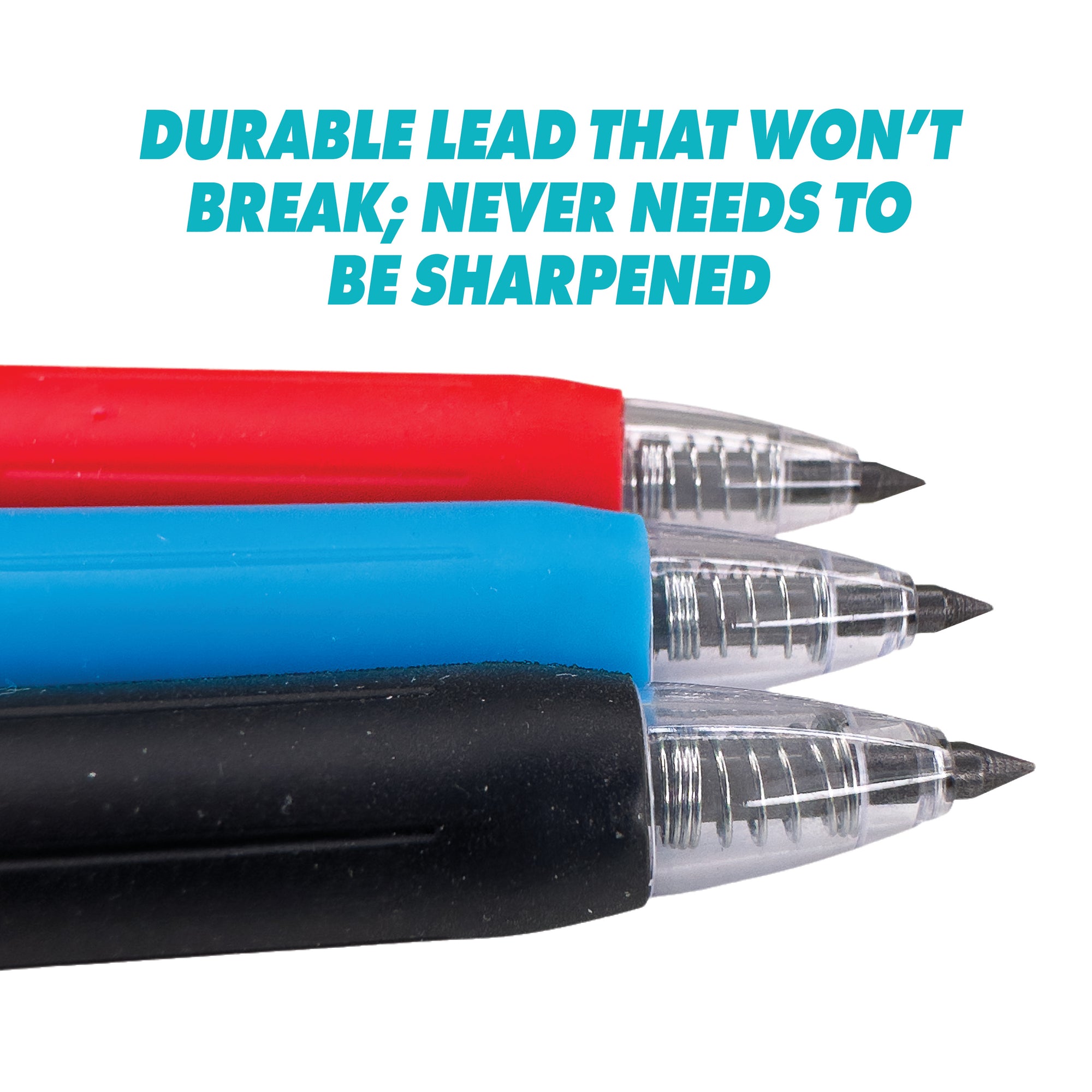 Retractable, long lasting pencil point - never needs to be sharpened. Spring loaded clip, clips to your paper, folder, backpack, pocket, and more. Colors: blue, red, and black. No eraser.