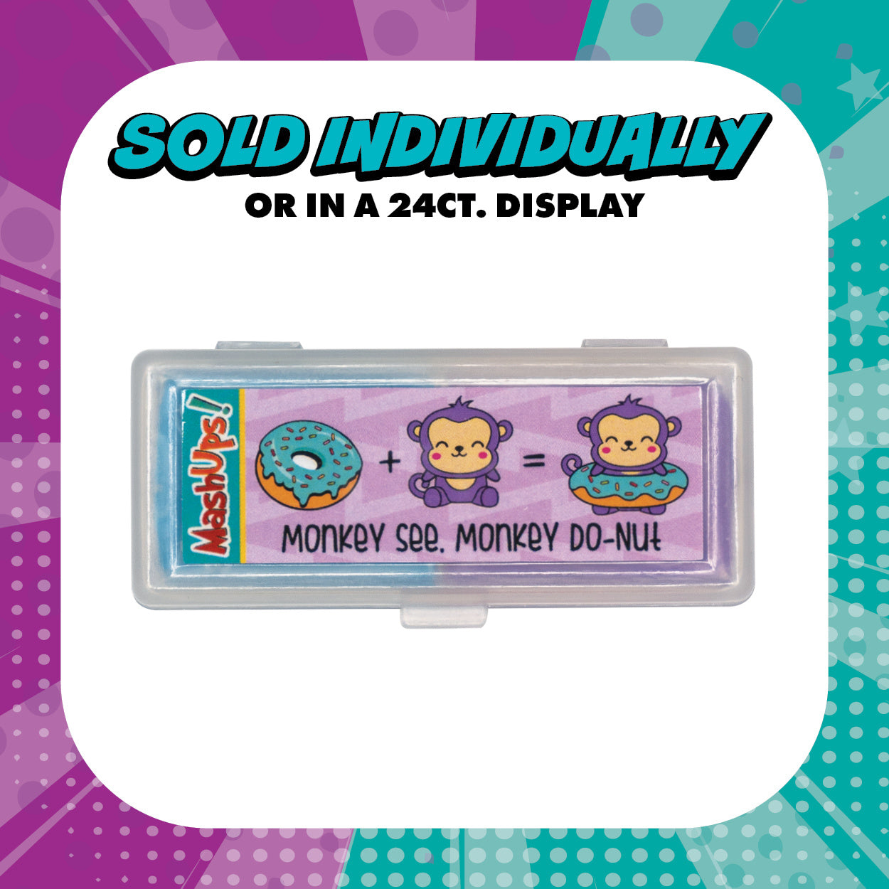2 colorful scented erasers in each case! Mash ‘em together to create a new scent! Combos include: Panda-Cake, Pupperoni Pizza, Avo-Cat-O, Ham-Bear-Ger, Uni-Cone, Cotton(tail) Candy, Monkey See, Monkey Do-Nut, and, Hot Diggity Dog! Pull and twist to make a clean eraser surface.