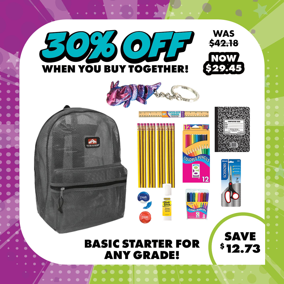 Looking for a lightweight, breathable, and practical back-to-school solution? Our Basic Essentials Bundle has everything your student needs to head back to class in style and comfort. This all-in-one bundle features a durable mesh backpack, and a complete set of school supplies - all for 30% off the regular price.
