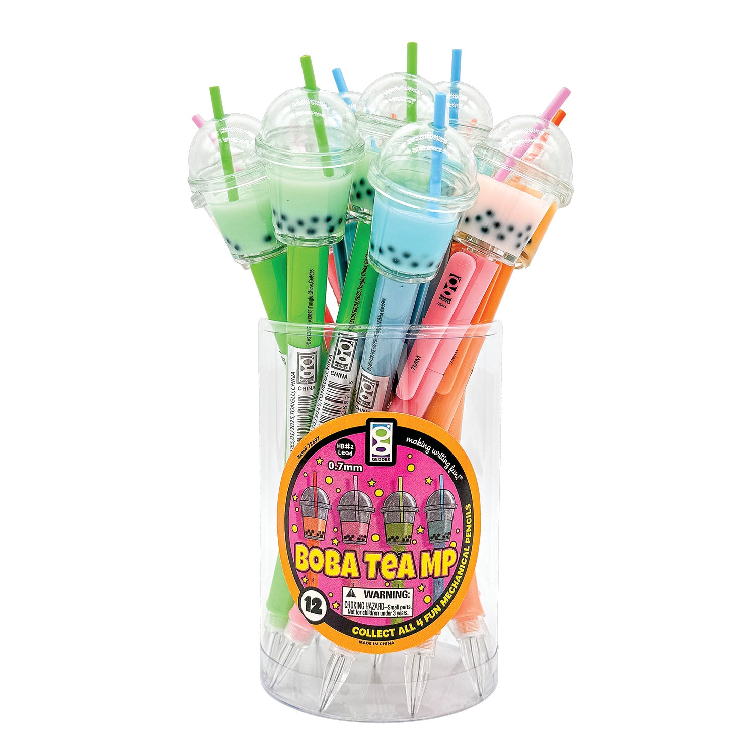 Mechanical pencils each adorned with a boba tea topper. Colors: butterfly pea, matcha, mango, and strawberry.