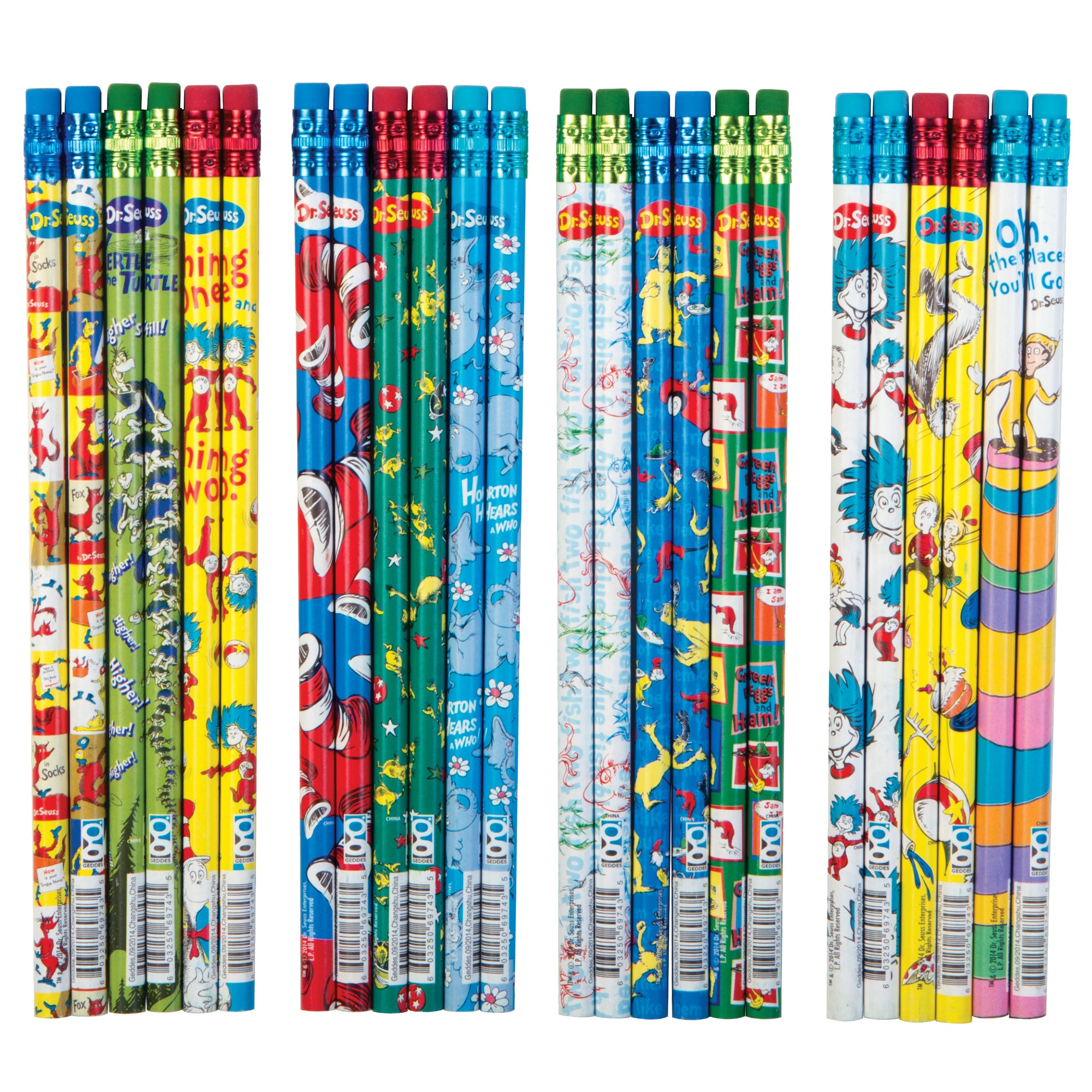 A super assortment of Dr. Seuss school supplies! This selection of 72 Dr. Seuss Pencils have 12 colorful designs featuring your favorite Dr. Seuss characters! The colorful designs will inspire your students to create awesome worlds of their very own!