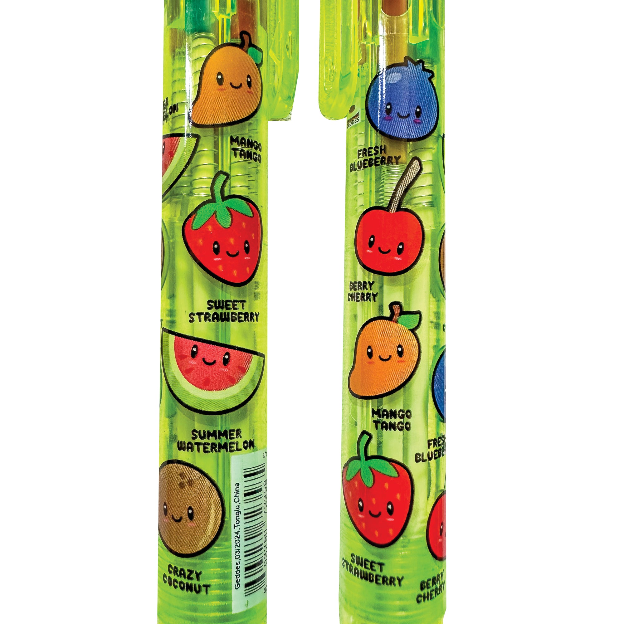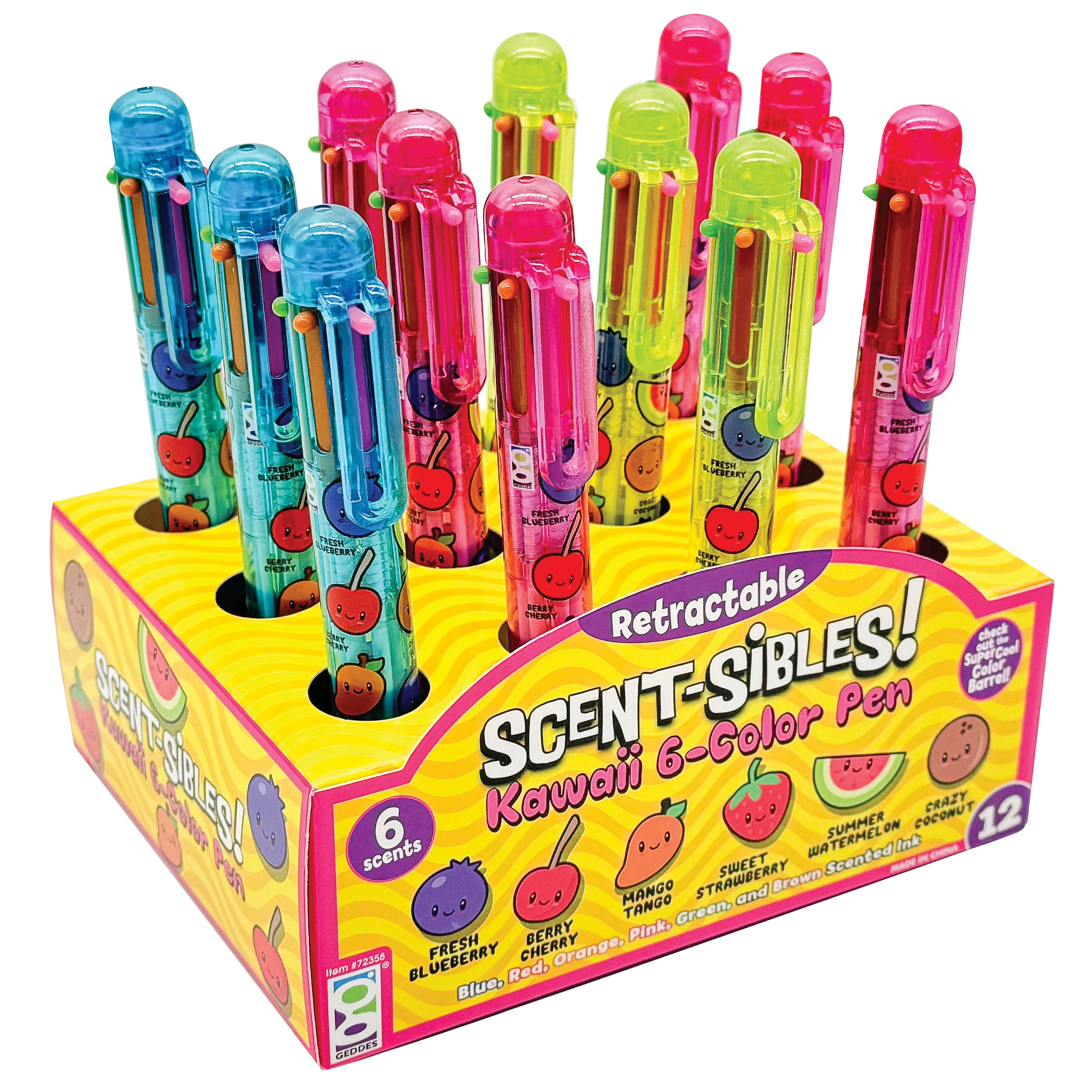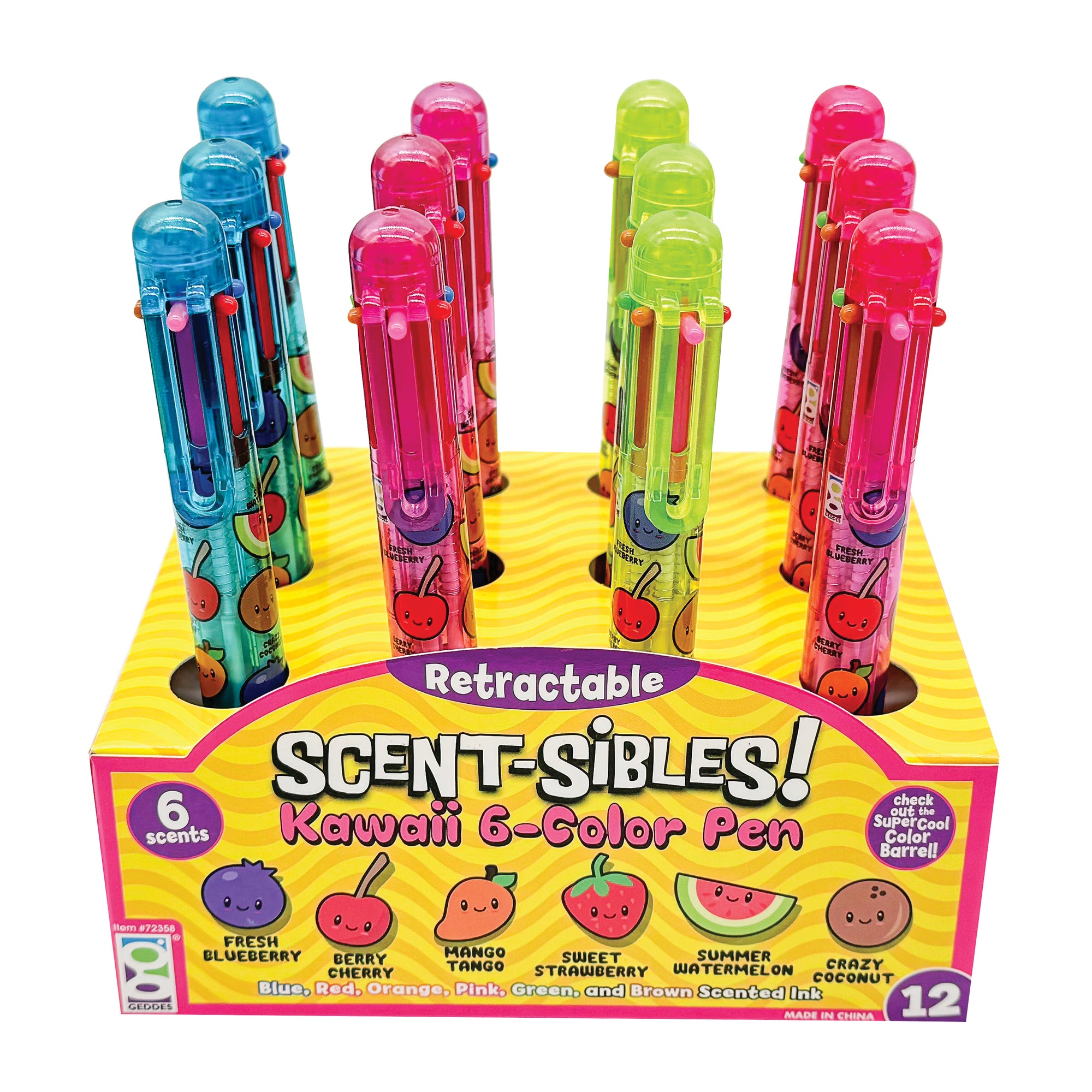 6 pens in 1, that are cute and super fun! Each pen features adorable Kawaii style fruit on the translucent barrel. 4 translucent pen colors: pink, blue, green and purple. 6 ink colors/scents: blue (blueberry), green (watermelon), pink (strawberry), red (cherry), orange (mango), and brown (coconut). Retractable, ball-point. Retractable. Easily change colors by sliding down switch.