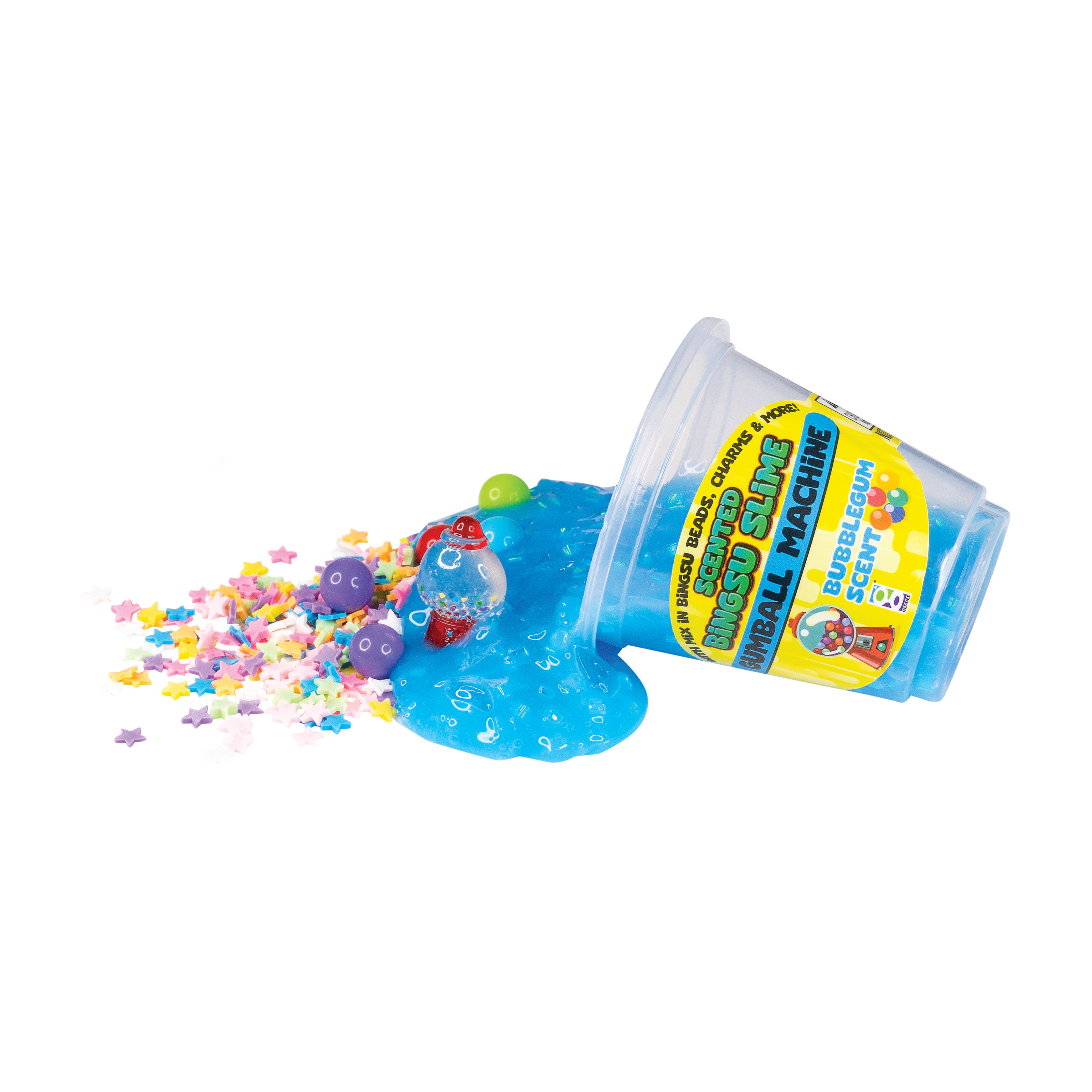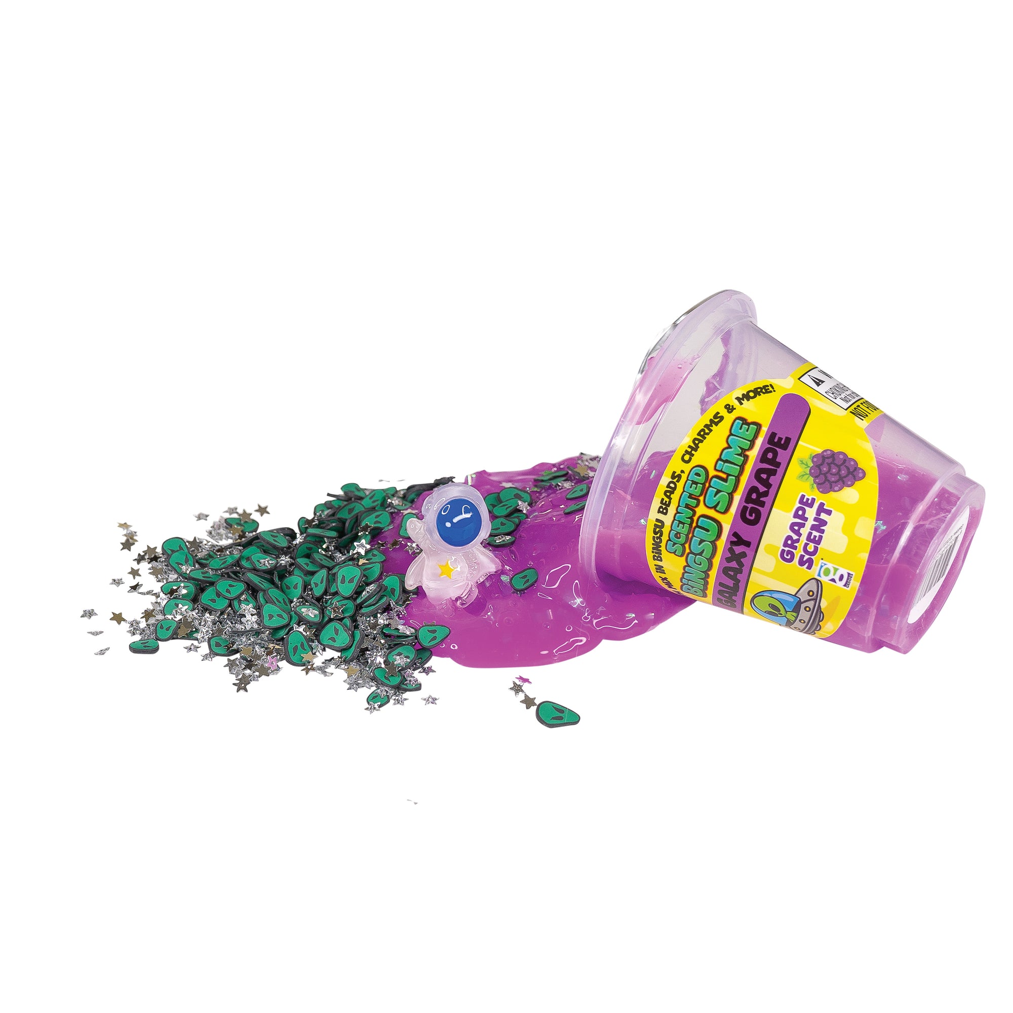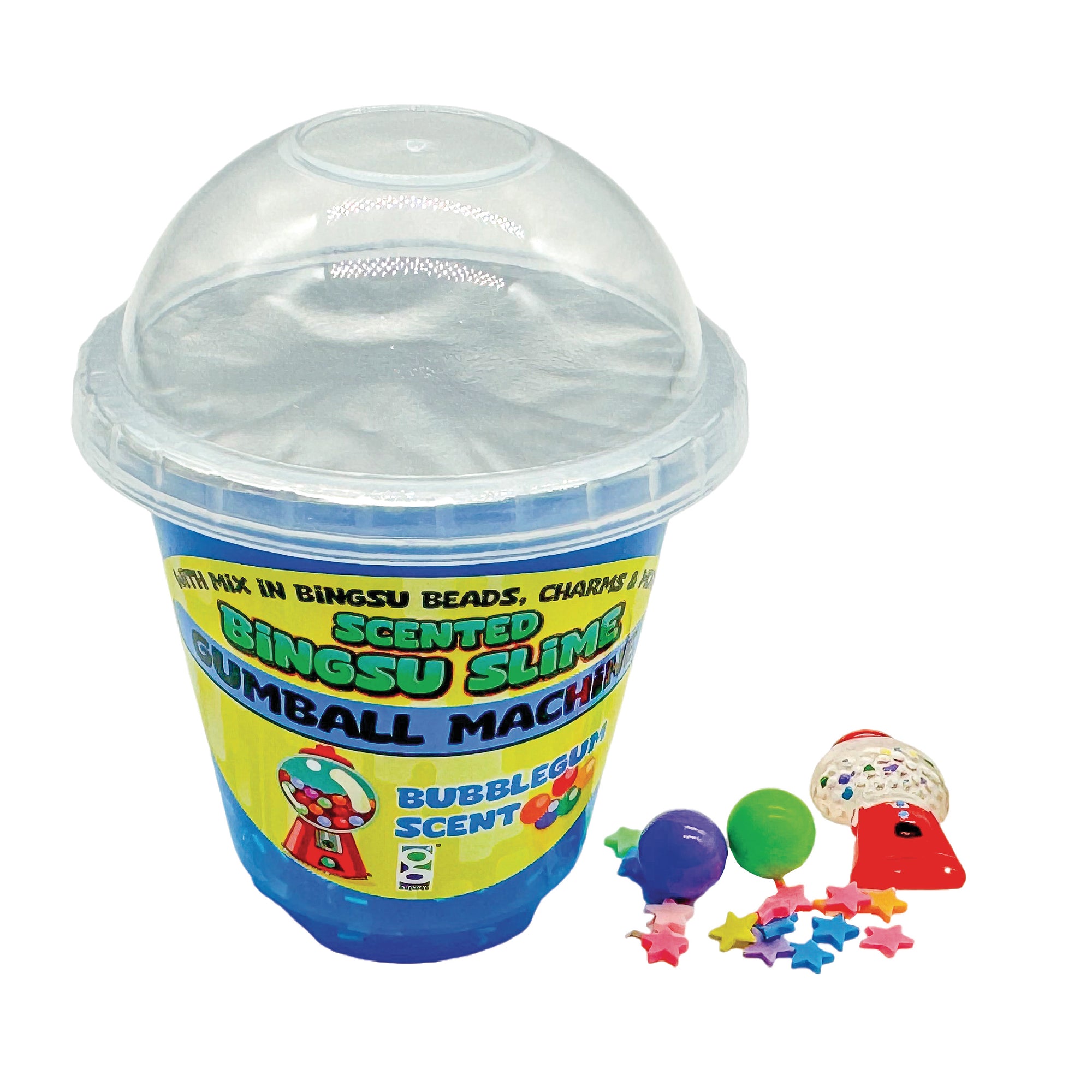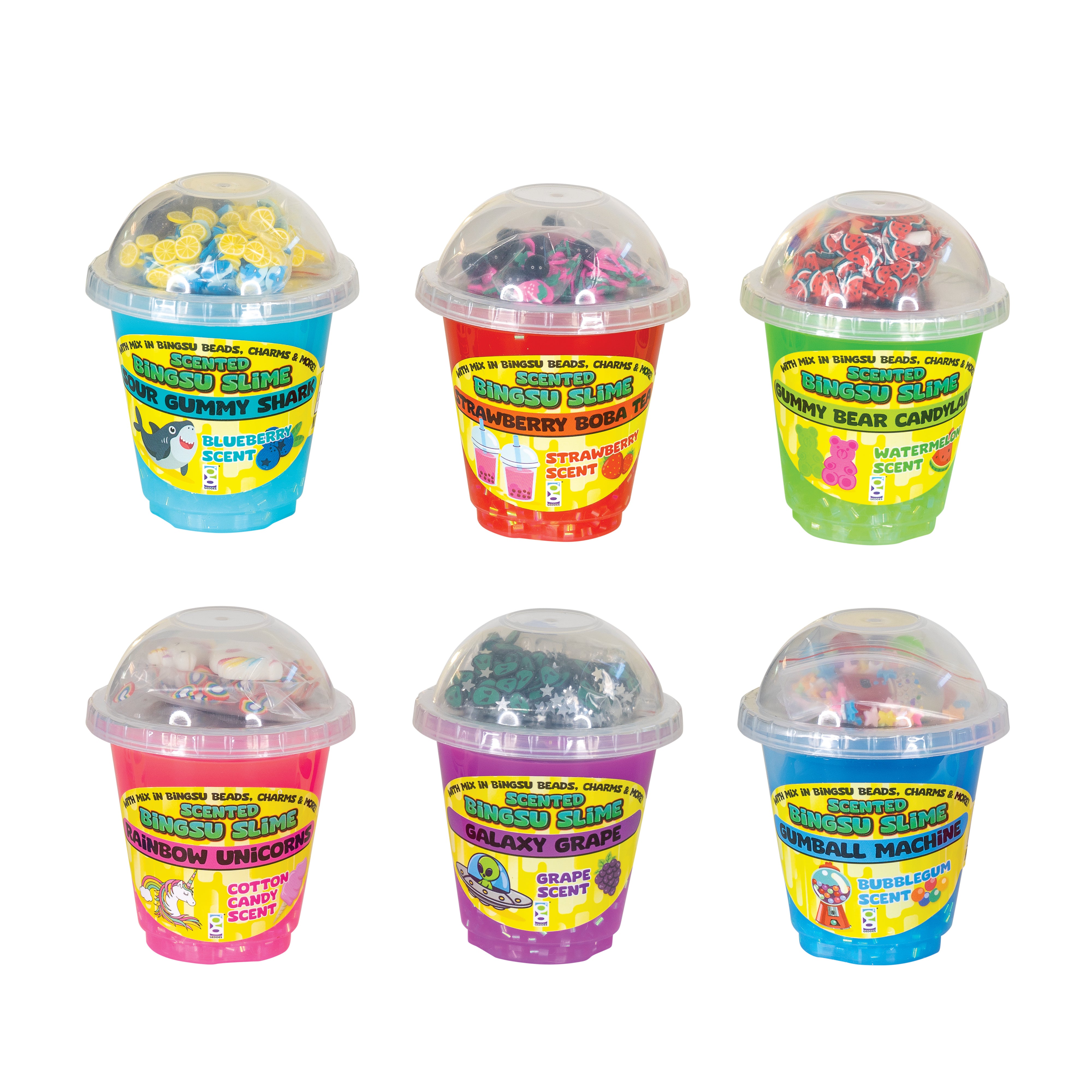 Our newest slime provides hours of ASMR fun! Each slime kit contains 1 color of scented slime, bingsu beads, fun charms + fimo pieces to mix in to create your very own ASMR slime experience.  Comes in 6 different fun themes/scents: Sour Gummy Shark: Blueberry scented slime (blue). Includes shark charm, lemon and shark mix-ins. Galaxy Grape: Grape scented slime (purple). Includes astronaut charm, alien head and star mix-ins Gummy Bear Candyland: Watermelon scented slime (green). Includes teddy bear and lollipop charms with watermelon mix-ins Strawberry Boba Tea: Strawberry scented slime (red). Includes boba tea charm, boba balls and strawberry mix-ins Gumball Machine: Bubble gum scented slime (blue). Includes gumball machine and gumball charms with star mix-ins Rainbow Unicorns: Cotton Candy scented slime (pink). Includes rainbow and unicorn charms with rainbow mix-ins.