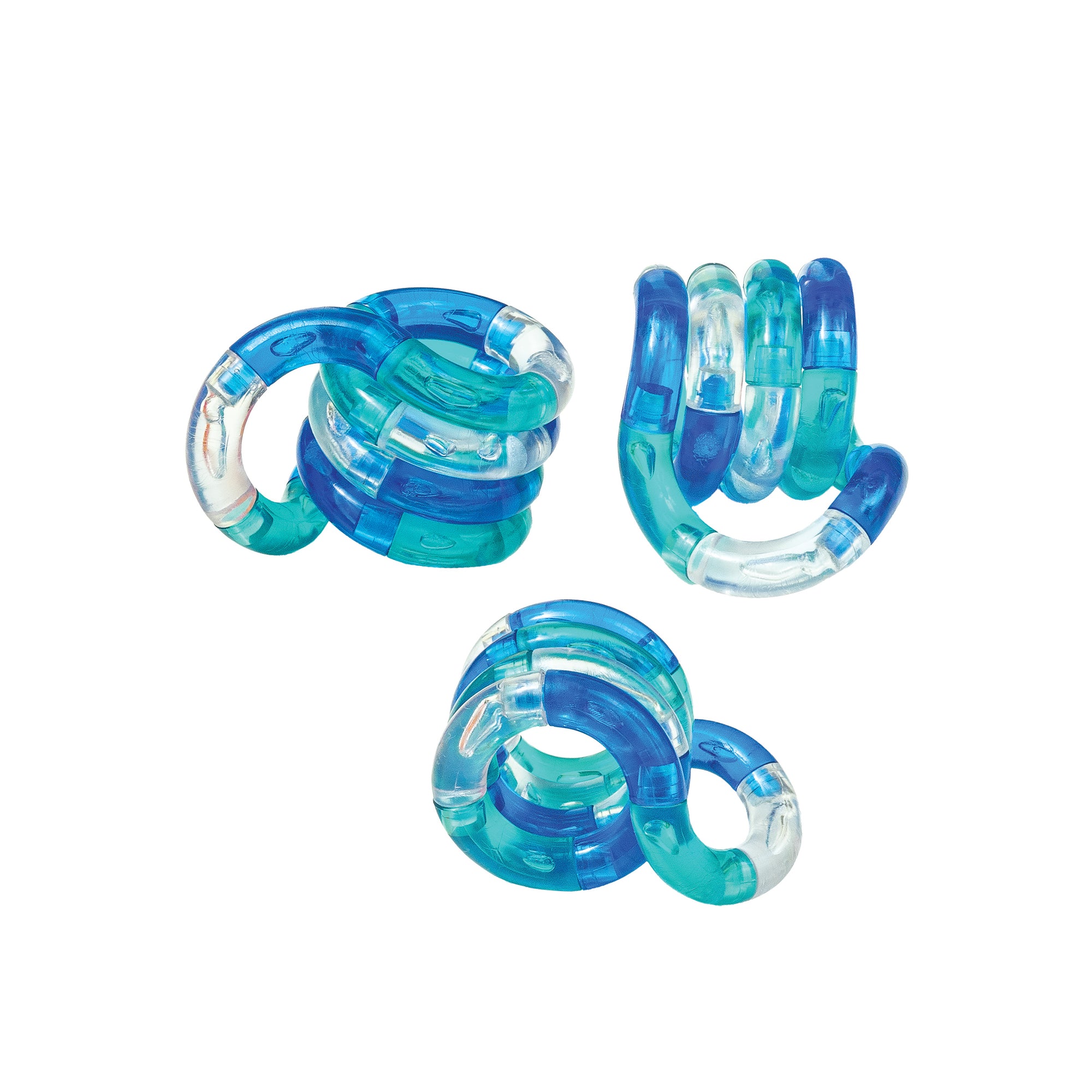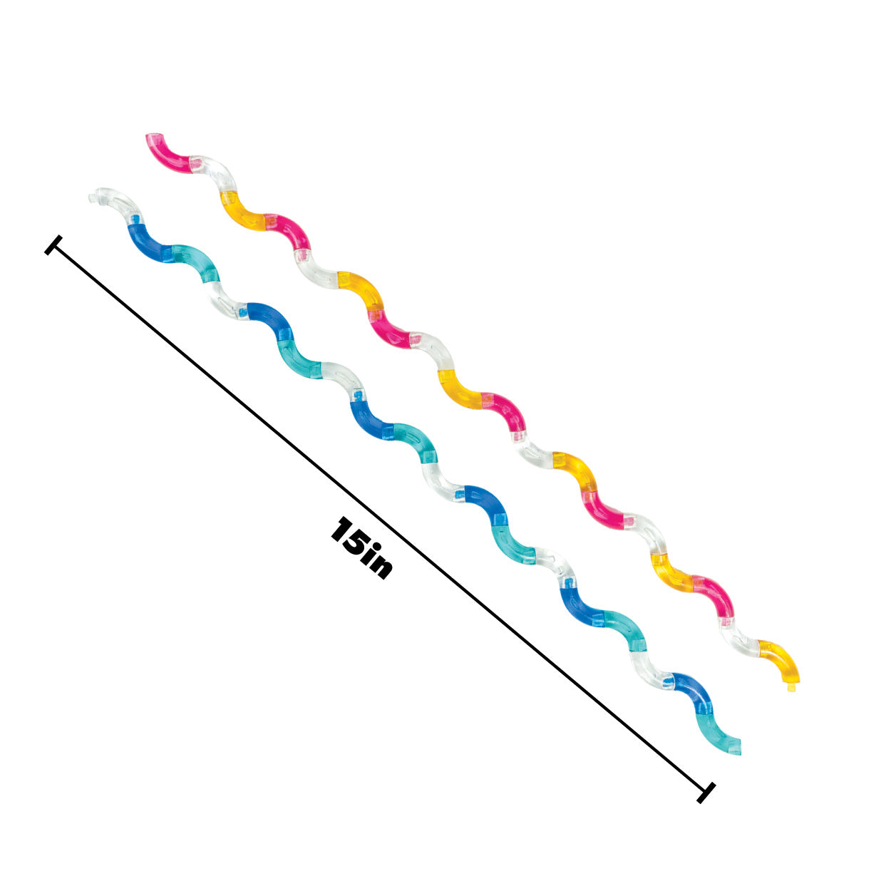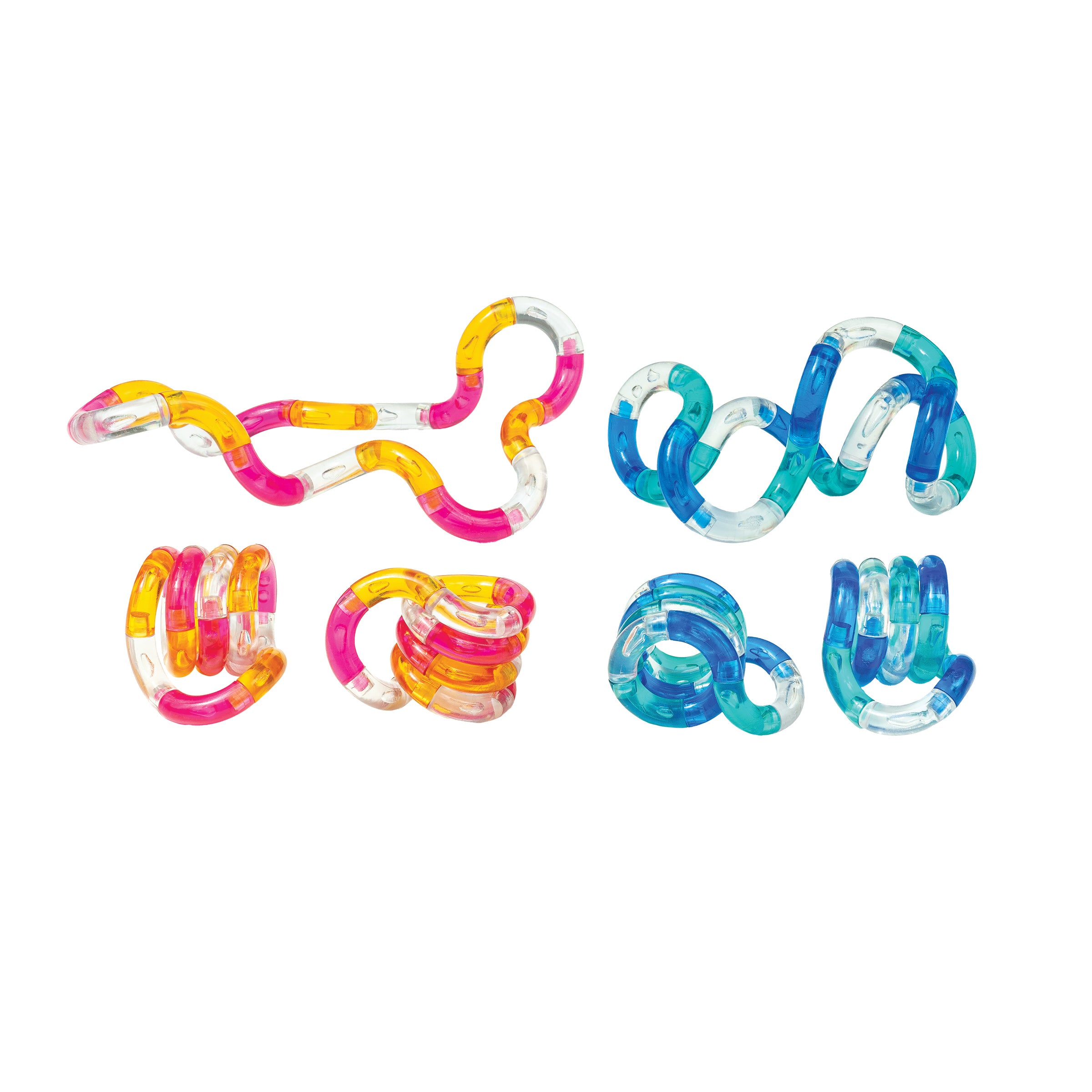 Twist it, bend it, link it, unlink it! Keep hands busy and focus strong with this unique twisting fidget toy. Great for creative play and relieving stress. Each Twisted Fidget Toy is made up of 18 interlocking pieces. Unlink to create your own color combo, make a chain, or a super long twisted toy. Connect it to your key ring for on the go! This quiet fidget toy is perfect for use in classrooms, at home, and more! 2 translucent color combos: pink/orange/clear and blue/aqua/clear.