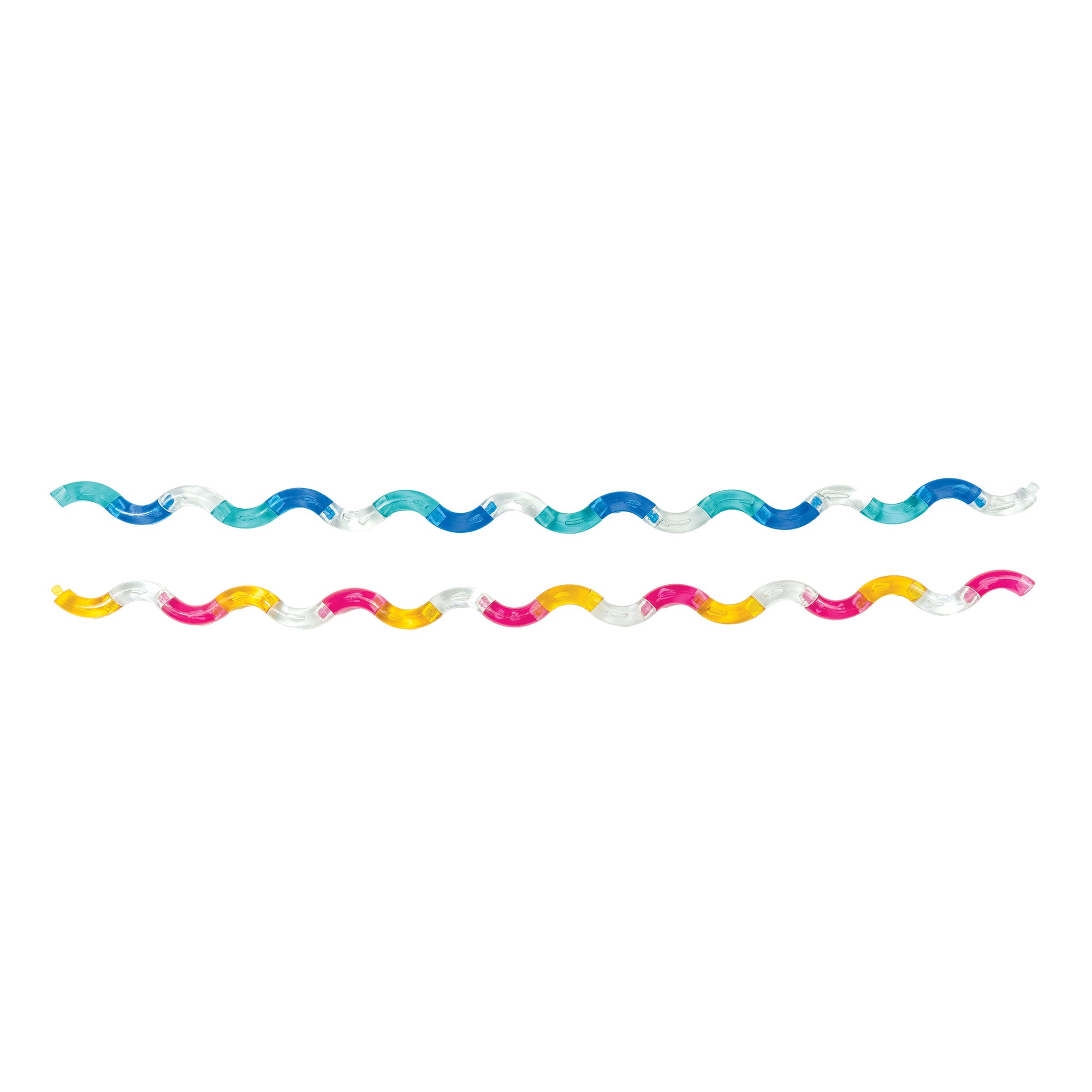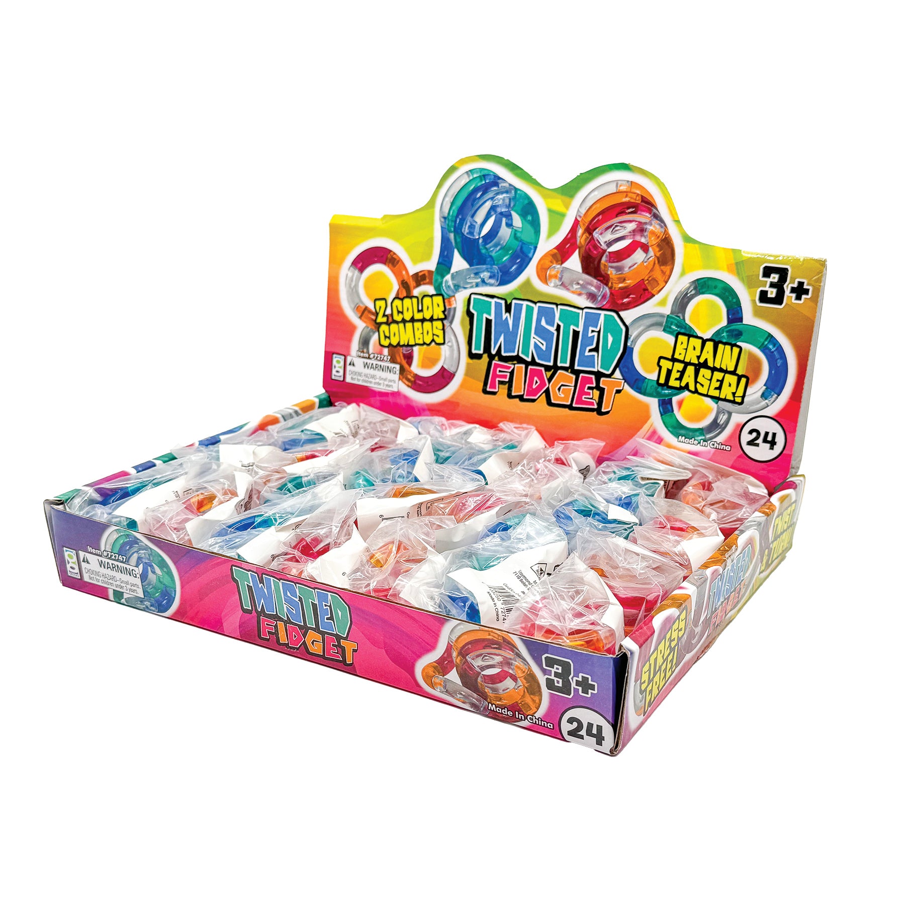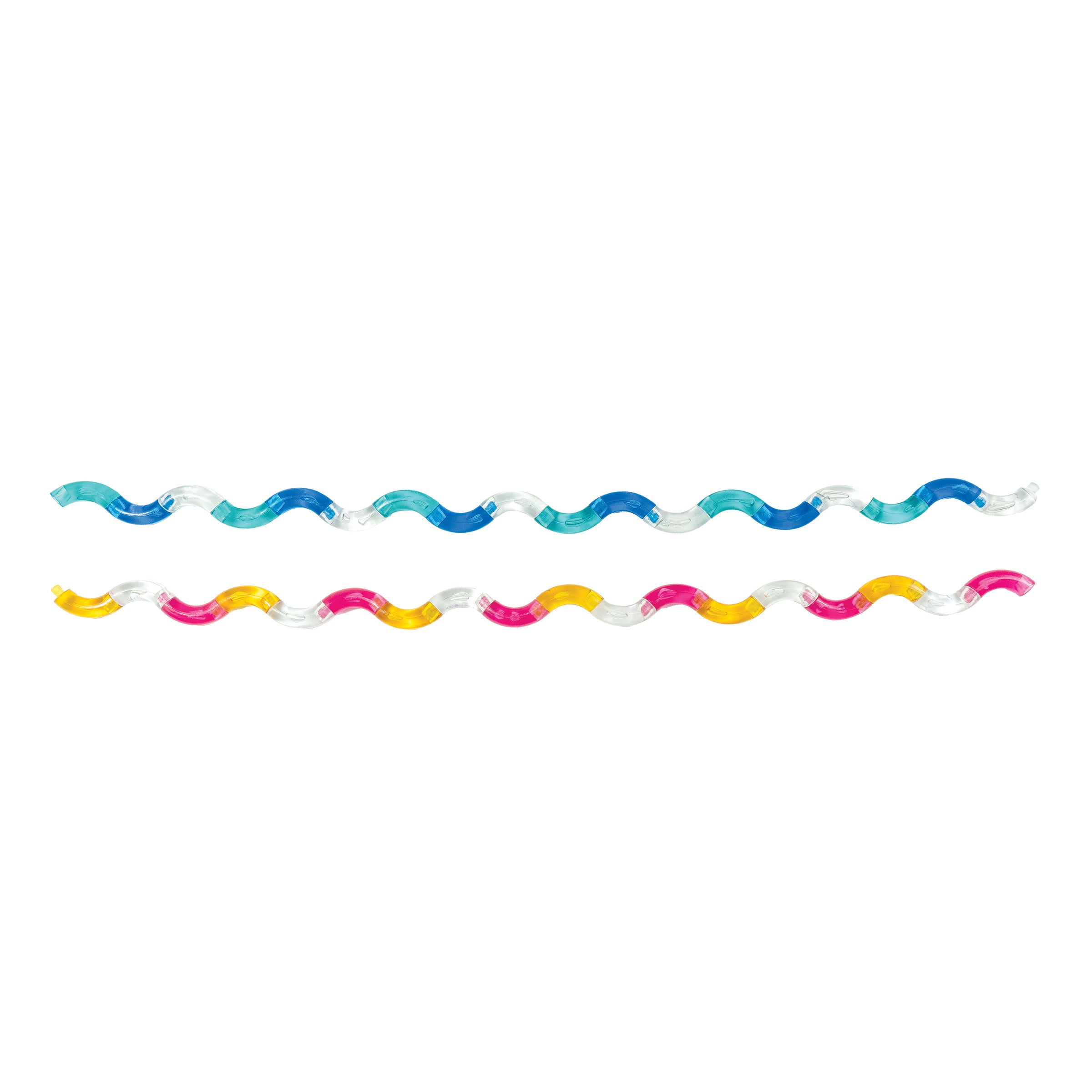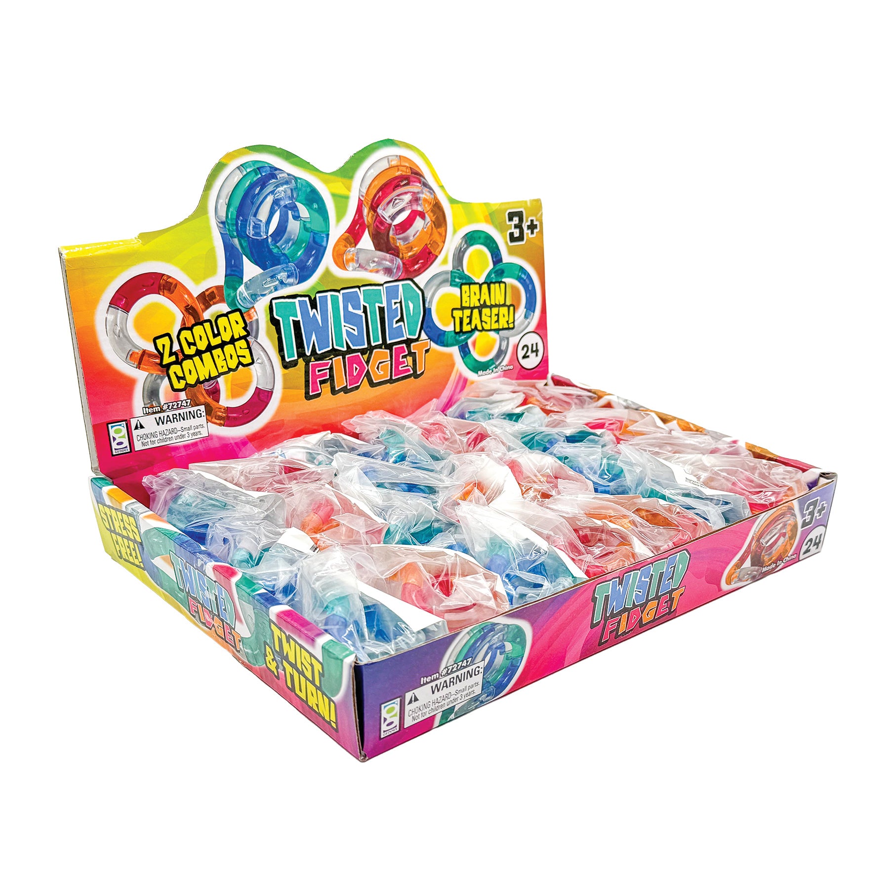 Twist it, bend it, link it, unlink it! Keep hands busy and focus strong with this unique twisting fidget toy. Great for creative play and relieving stress. Each Twisted Fidget Toy is made up of 18 interlocking pieces. Unlink to create your own color combo, make a chain, or a super long twisted toy. Connect it to your key ring for on the go! This quiet fidget toy is perfect for use in classrooms, at home, and more! 2 translucent color combos: pink/orange/clear and blue/aqua/clear.